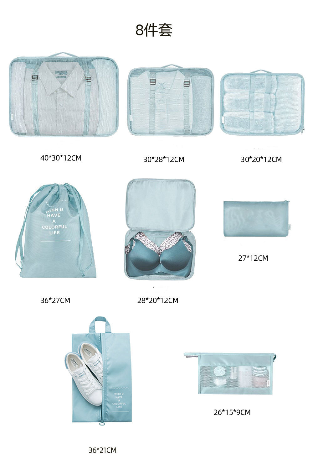 | Имя | Водонепроницаемый набор органайзеров для путешествий, 8 шт., кубики для упаковки багажа, упаковочный куб для туалетных принадлежностей для чемодана | ||||||