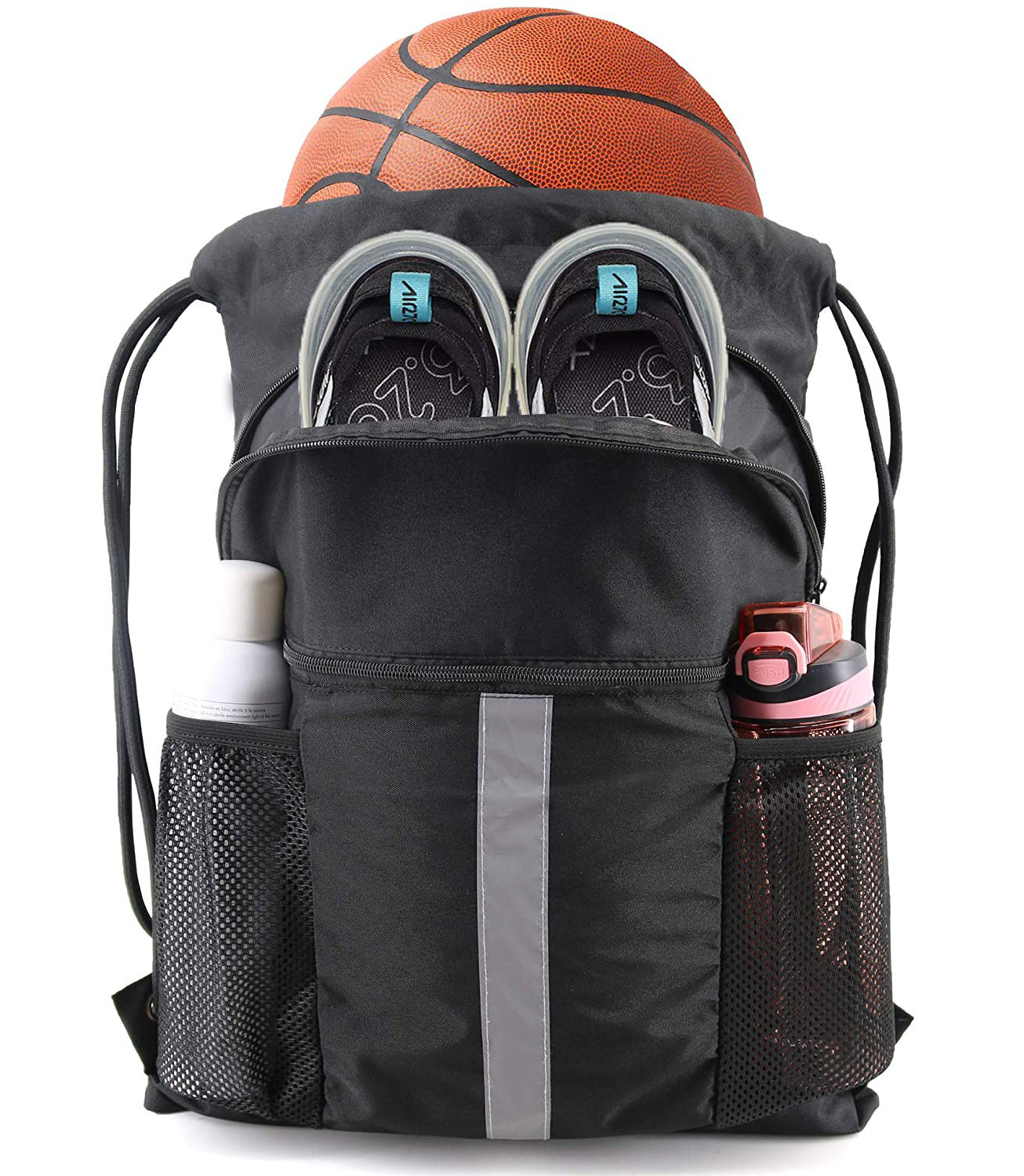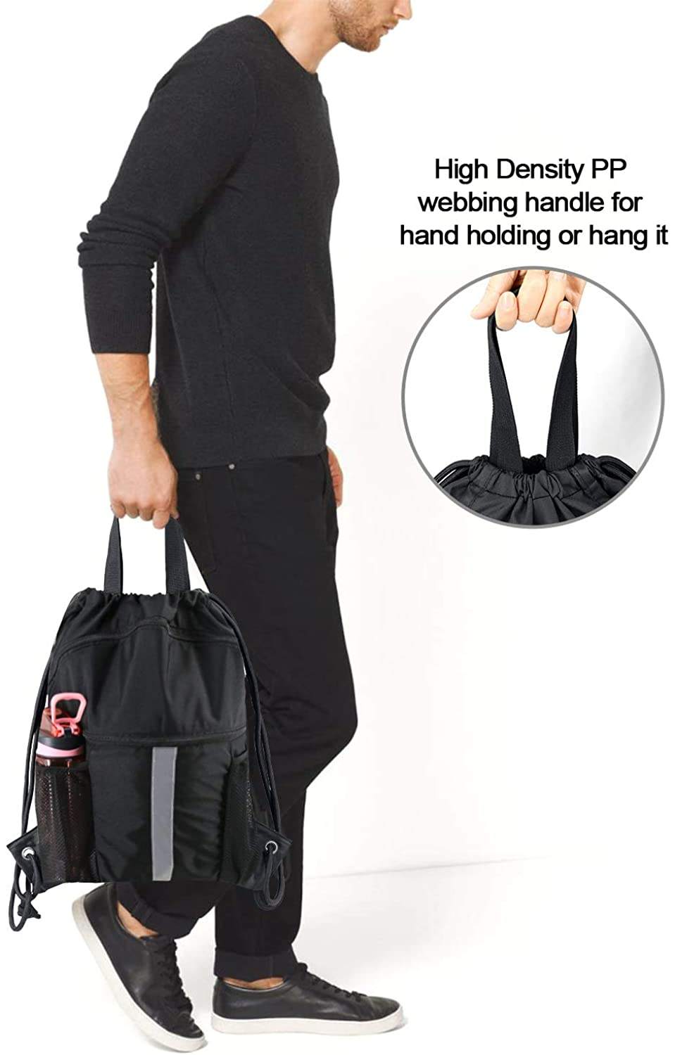 Дом / Продукты / Рюкзак / Спортивный рюкзак / Сумка-рюкзак на шнурке с отделением для обуви Черная сумка на шнурке с сетчатыми держателями для бутылок с водой сумка для обуви на шнурке